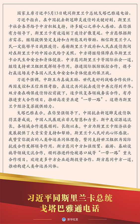 新華社北京5月13日電 國家主席習(xí)近平5月13日晚同斯里蘭卡總統(tǒng)戈塔巴雅通電話。