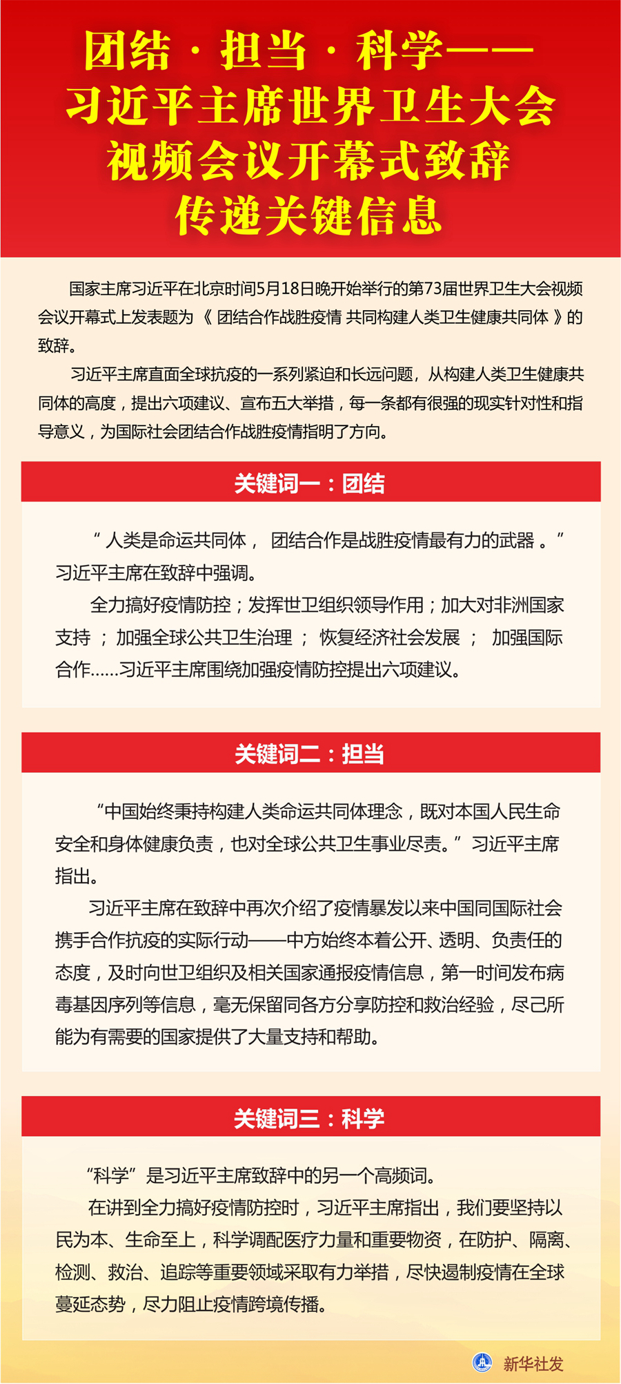 新華社北京5月18日電? 綜合新華社駐外記者報(bào)道:國(guó)家主席習(xí)近平18日晚在第73屆世界衛(wèi)生大會(huì)視頻會(huì)議開幕式上發(fā)表題為《團(tuán)結(jié)合作戰(zhàn)勝疫情 共同構(gòu)建人類衛(wèi)生健康共同體》的致辭。世界衛(wèi)生組織官員及多國(guó)人士認(rèn)為,習(xí)近平主席在致辭中提出的加強(qiáng)疫情防控六項(xiàng)建議、中國(guó)為推進(jìn)全球抗疫合作的五大舉措秉持構(gòu)建人類命運(yùn)共同體理念,體現(xiàn)了中國(guó)負(fù)責(zé)任大國(guó)擔(dān)當(dāng),對(duì)推動(dòng)抗擊疫情國(guó)際合作具有重要意義。