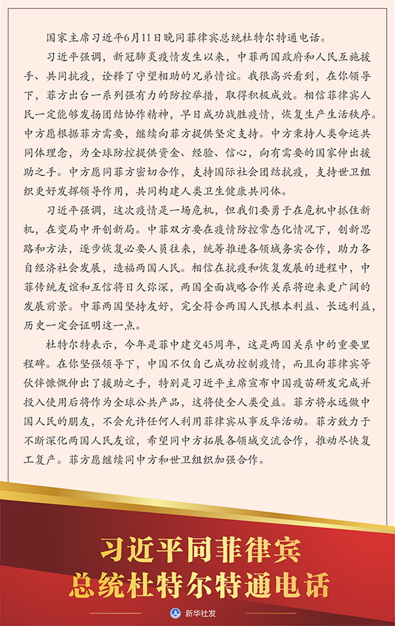 習(xí)近平強調(diào),新冠肺炎疫情發(fā)生以來,中菲兩國政府和人民互施援手、共同抗疫,詮釋了守望相助的兄弟情誼。我很高興看到,在你領(lǐng)導(dǎo)下,菲方出臺一系列強有力的防控舉措,取得積極成效。相信菲律賓人民一定能夠發(fā)揚團(tuán)結(jié)協(xié)作精神,早日成功戰(zhàn)勝疫情,恢復(fù)生產(chǎn)生活秩序。中方愿根據(jù)菲方需要,繼續(xù)向菲方提供堅定支持。中方秉持人類命運共同體理念,為全球防控提供資金、經(jīng)驗、信心,向有需要的國家伸出援助之手。中方愿同菲方密切合作,支持國際社會團(tuán)結(jié)抗疫,支持世衛(wèi)組織更好發(fā)揮領(lǐng)導(dǎo)作用,共同構(gòu)建人類衛(wèi)生健康共同體。