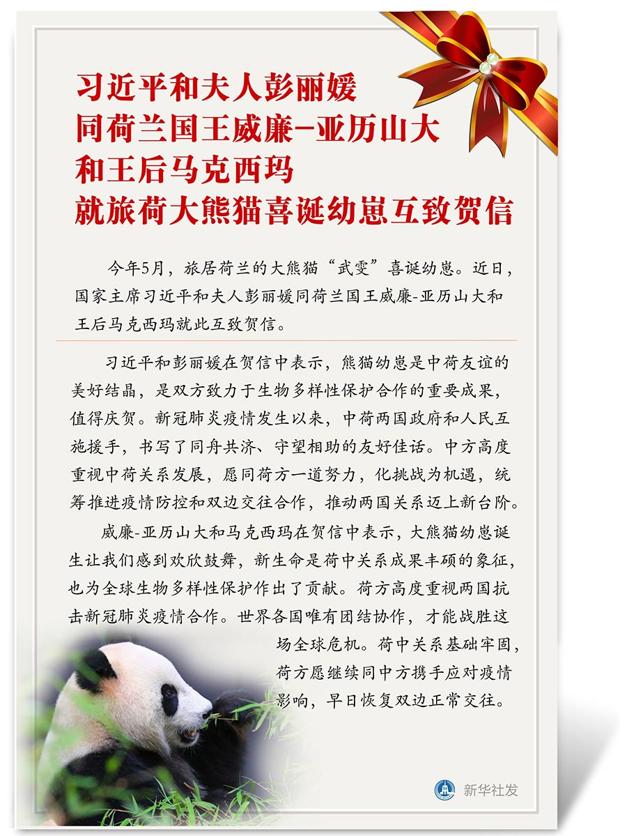 習(xí)近平和彭麗媛在賀信中表示,熊貓幼崽是中荷友誼的美好結(jié)晶,是雙方致力于生物多樣性保護(hù)合作的重要成果,值得慶賀。新冠肺炎疫情發(fā)生以來,中荷兩國政府和人民互施援手,書寫了同舟共濟(jì)、守望相助的友好佳話。中方高度重視中荷關(guān)系發(fā)展,愿同荷方一道努力,化挑戰(zhàn)為機(jī)遇,統(tǒng)籌推進(jìn)疫情防控和雙邊交往合作,推動兩國關(guān)系邁上新臺階。