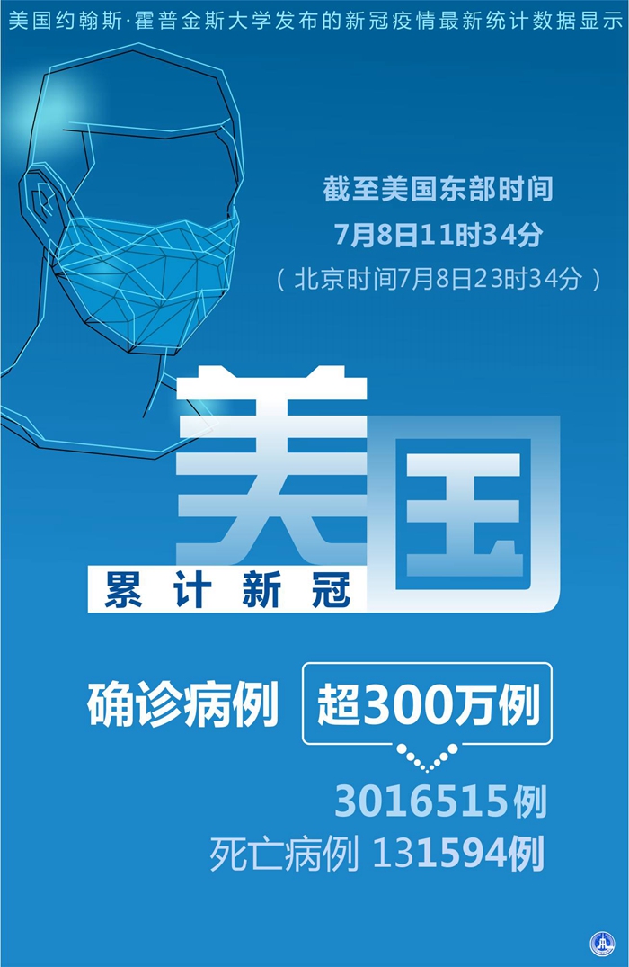 新華社紐約7月8日電 美國約翰斯·霍普金斯大學8日發(fā)布的新冠疫情最新統(tǒng)計數(shù)據(jù)顯示,美國累計確診病例超過300萬例。