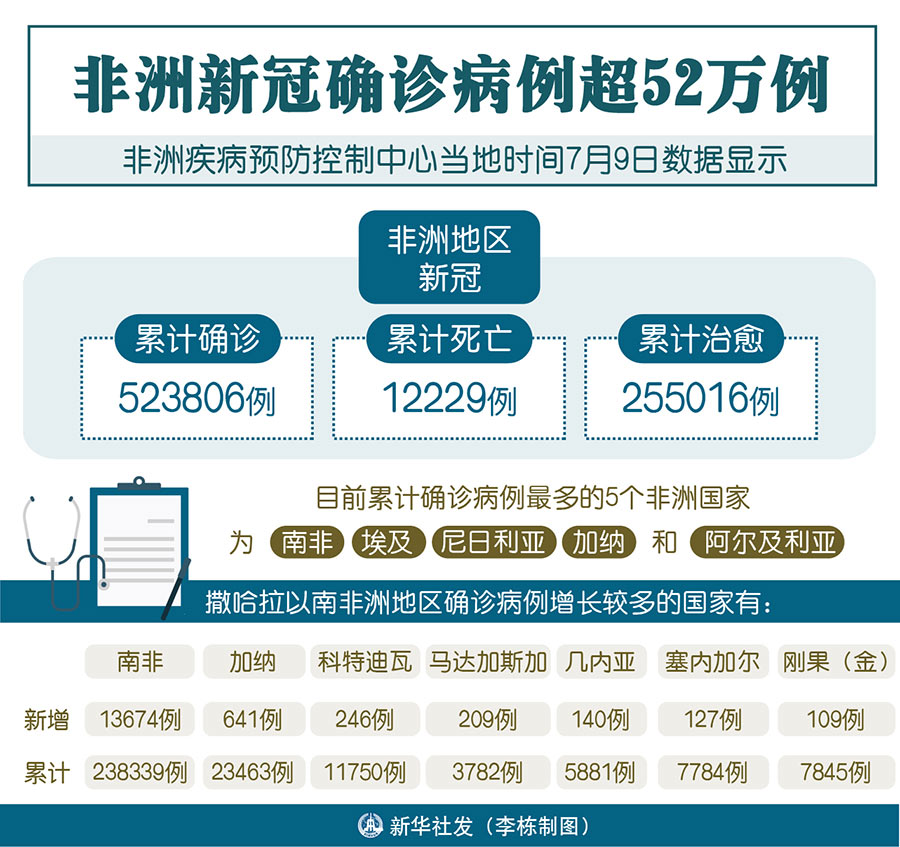 新華社雅溫得7月9日電 綜合新華社駐非洲地區(qū)記者報(bào)道:非洲疾病預(yù)防控制中心9日數(shù)據(jù)顯示,非洲地區(qū)新冠累計(jì)確診病例已達(dá)523806例,累計(jì)死亡12229例,累計(jì)治愈255016例。
