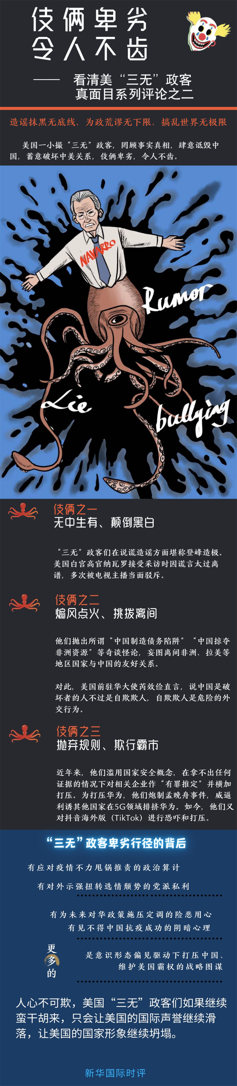 回憶在中央情報(bào)局的任職經(jīng)歷時(shí),美國國務(wù)卿蓬佩奧難得說了句實(shí)話:“我們?nèi)鲋e、我們欺騙、我們偷竊……這才是美國不斷探索進(jìn)取的榮耀?!痹谶@種畸形價(jià)值觀的驅(qū)動(dòng)下,美國一小撮造謠抹黑無底線、為政荒謬無下限、搞亂世界無極限的“三無”政客罔顧事實(shí)真相,肆意詆毀中國,蓄意破壞中美關(guān)系,伎倆卑劣,令人不齒。