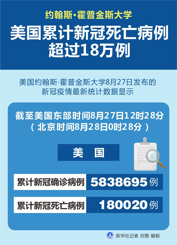 新華社紐約8月27日電? 美國約翰斯·霍普金斯大學(xué)27日發(fā)布的新冠疫情最新統(tǒng)計數(shù)據(jù)顯示,截至美國東部時間27日12時28分(北京時間28日0時28分),美國累計新冠死亡病例180020例,累計確診病例5838695例。