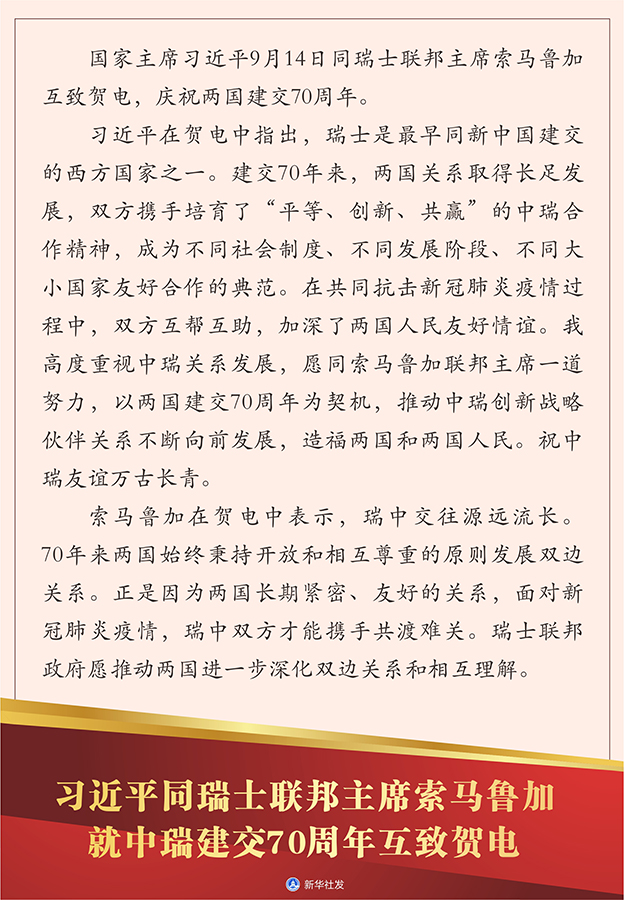 新華社北京9月14日電 國家主席習近平9月14日同瑞士聯(lián)邦主席索馬魯加互致賀電,慶祝兩國建交70周年。