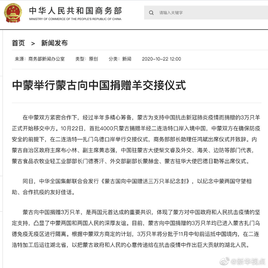 10月22日,首批4000只蒙古國捐贈(zèng)羊經(jīng)二連浩特口岸入境中國,中蒙雙方在確保防疫安全的前提下,在二連浩特—扎門烏德口岸舉行交接儀式。詳情?? ????