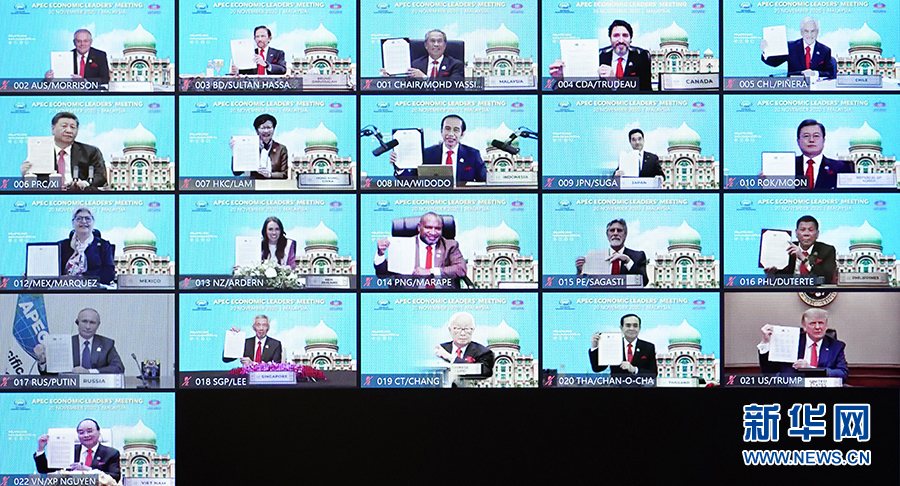11月20日晚,國(guó)家主席習(xí)近平在北京以視頻方式出席亞太經(jīng)合組織第二十七次領(lǐng)導(dǎo)人非正式會(huì)議并發(fā)表重要講話。這是與會(huì)各經(jīng)濟(jì)體領(lǐng)導(dǎo)人、代表通過(guò)《2040年亞太經(jīng)合組織布特拉加亞愿景》并線上合影。 新華社記者 李響 攝