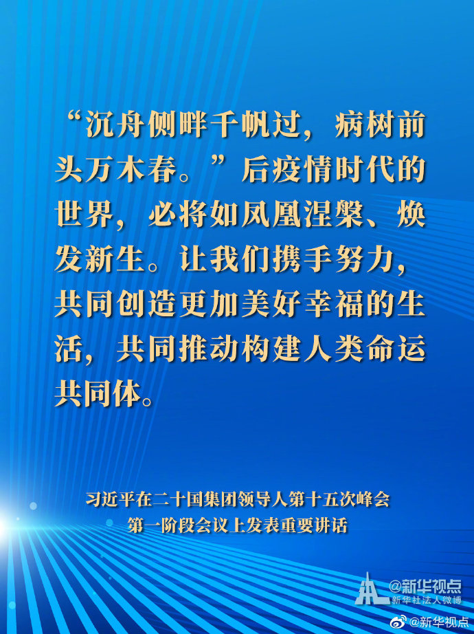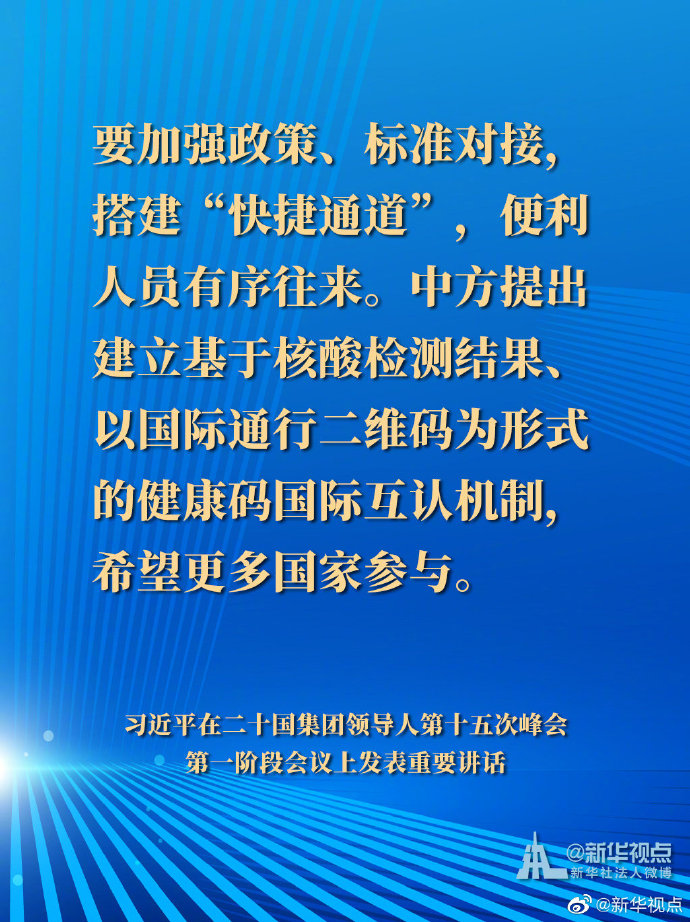 國家主席習(xí)近平21日晚在北京以視頻方式出席二十國集團(tuán)領(lǐng)導(dǎo)人第十五次峰會第一階段會議并發(fā)表重要講話。以下是講話要點(diǎn)。