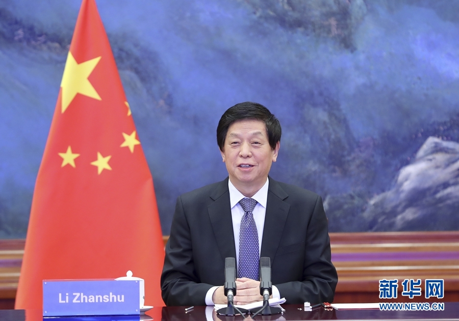 12月15日,全國人大常委會(huì)委員長栗戰(zhàn)書在北京人民大會(huì)堂以視頻方式同日本眾議長大島理森舉行會(huì)談。新華社記者 丁海濤 攝