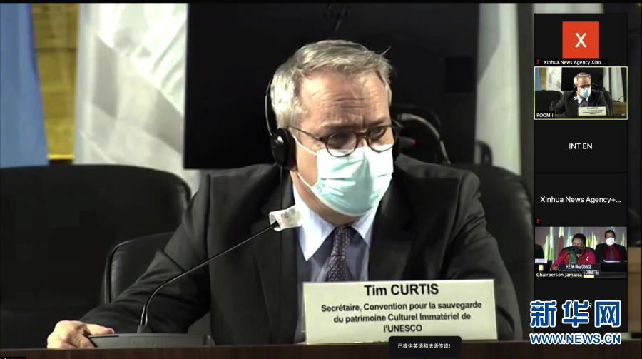 這張12月18日的視頻截圖顯示的是,聯(lián)合國教科文組織《保護非物質(zhì)文化遺產(chǎn)公約》秘書蒂姆·柯蒂斯在法國巴黎參加線上視頻會議。新華社發(fā)