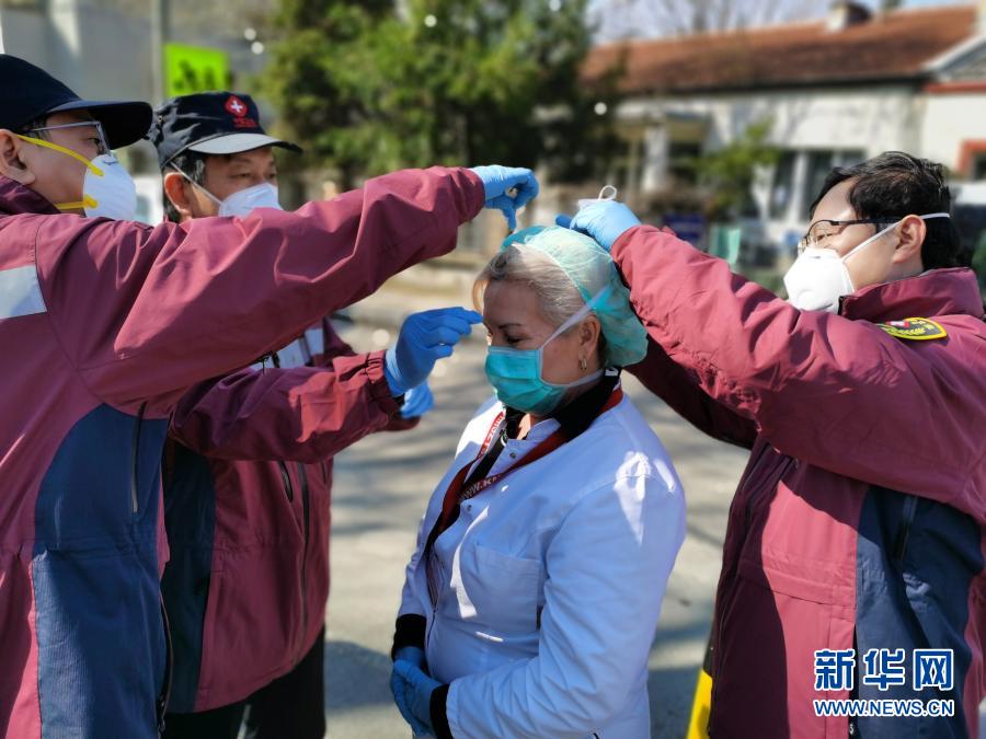 4月4日,中國(guó)赴塞爾維亞抗疫醫(yī)療專(zhuān)家組在貝爾格萊德的基層發(fā)熱門(mén)診走訪時(shí),幫助塞爾維亞醫(yī)生特里富諾維奇(中)佩戴高標(biāo)準(zhǔn)的防護(hù)口罩。新華社發(fā)