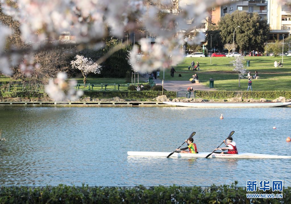 3月24日,市民在意大利首都羅馬的一處水面上劃船。新華社記者 程婷婷 攝
