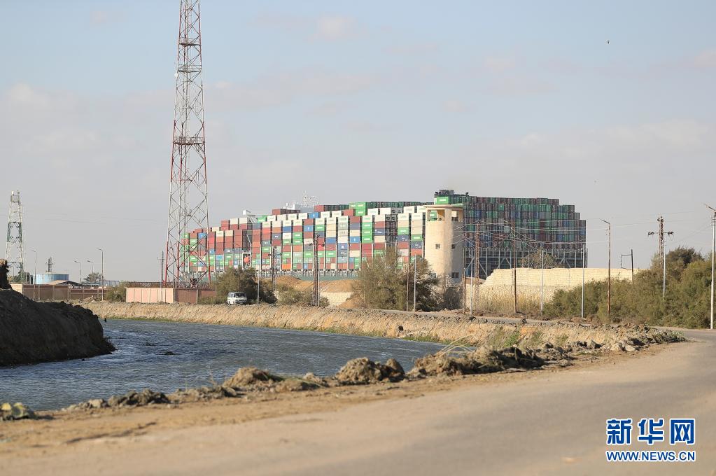這是3月29日拍攝的移動(dòng)至埃及蘇伊士運(yùn)河正常航道上的重型貨輪。