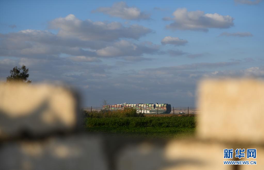 這是3月29日拍攝的移動(dòng)至埃及蘇伊士運(yùn)河正常航道上的重型貨輪。