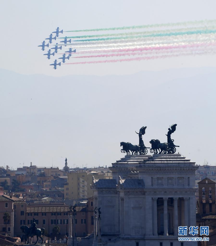 當(dāng)日,意大利“三色箭”飛行表演隊在意大利首都羅馬舉行飛行表演,慶祝意大利空軍建立98周年。