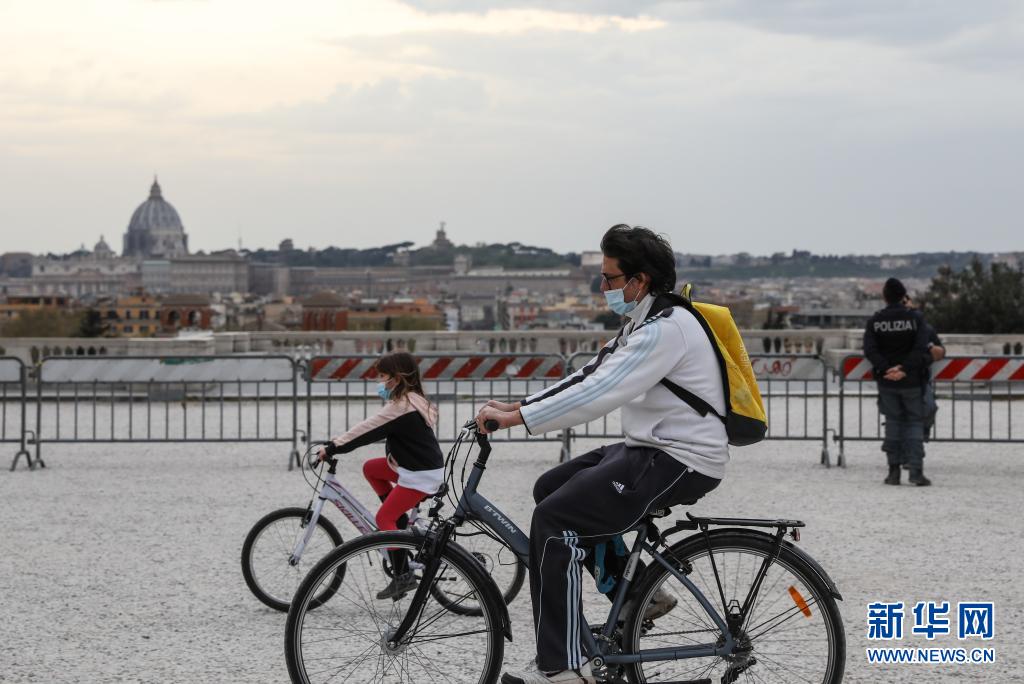 4月3日,人們騎車經(jīng)過意大利羅馬的蘋丘觀景臺(tái)。