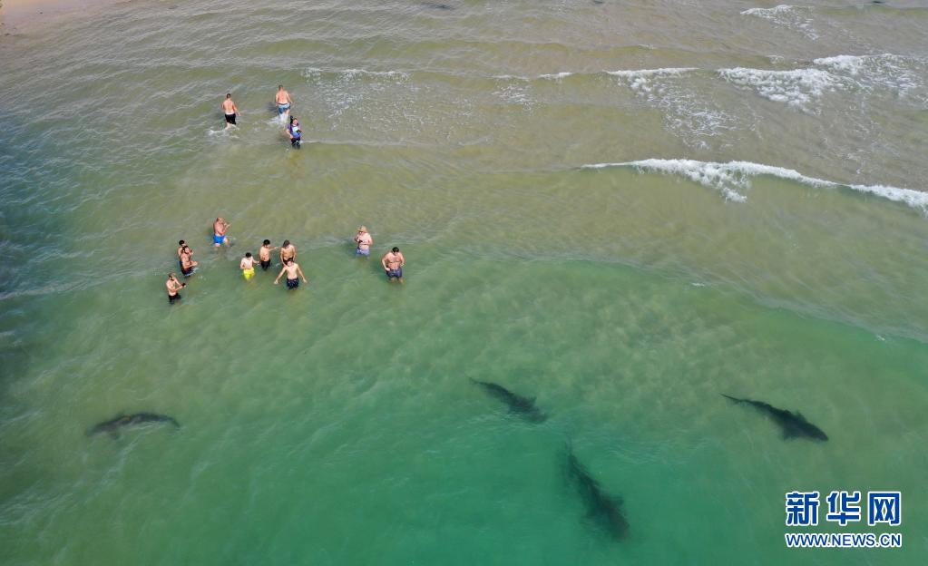 4月20日,在以色列北部城市哈代拉的海邊,鯊魚(yú)從人們身邊游過(guò)(無(wú)人機(jī)照片)。