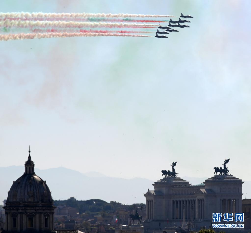 4月25日,意大利“三色箭”飛行表演隊(duì)在羅馬舉行的紀(jì)念儀式上噴出代表意大利國(guó)旗顏色的紅白綠三色煙霧。