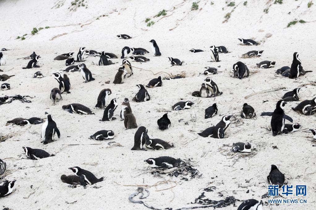 4月25日,一群非洲企鵝在南非西蒙鎮(zhèn)企鵝灘上行走。