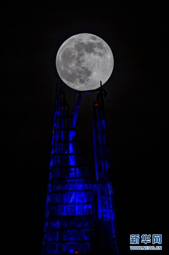 這是4月26日在英國(guó)倫敦拍攝的“碎片大廈”旁的“超級(jí)月亮”。