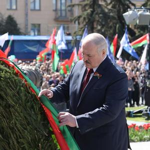 5月9日,白俄羅斯總統(tǒng)盧卡申科在明斯克向勝利紀(jì)念碑獻花。