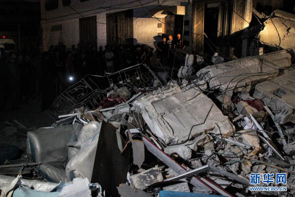 5月15日,人們聚集在加沙城一處遭空襲的難民營(yíng)。