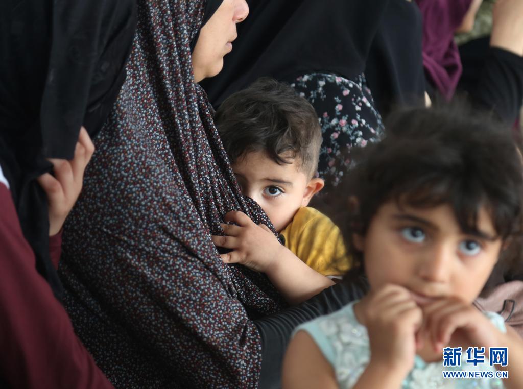 5月17日,受巴以沖突影響而逃離家園的巴勒斯坦婦女和兒童在加沙地帶拉法的一所學校臨時棲身。