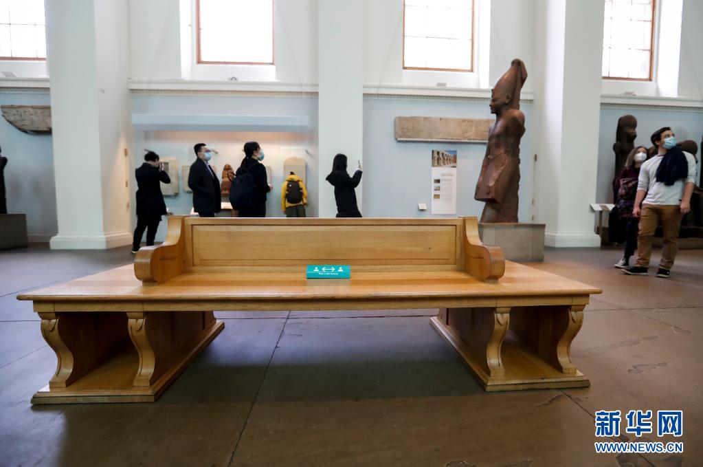 5月17日,在英國(guó)倫敦的大英博物館,座椅上放置著提醒參觀者保持安全距離的提示牌。