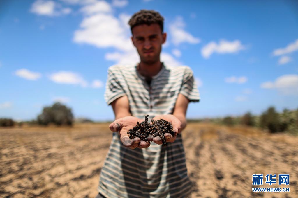 5月22日,在加沙地帶汗尤尼斯,巴勒斯坦農(nóng)民手捧被以色列炮擊燒焦的麥子。新華社發(fā)(亞西爾攝)