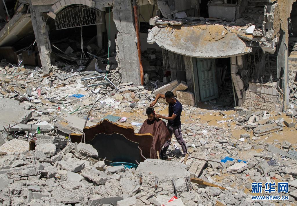 5月26日,在加沙地帶北部的城鎮(zhèn)貝特拉希亞,23歲的巴勒斯坦理發(fā)師阿卜杜拉·扎瓦拉在他被以色列炸毀的房屋前為顧客免費服務(wù)?!⌒氯A社發(fā)(里澤克·阿卜杜勒·賈瓦德攝)