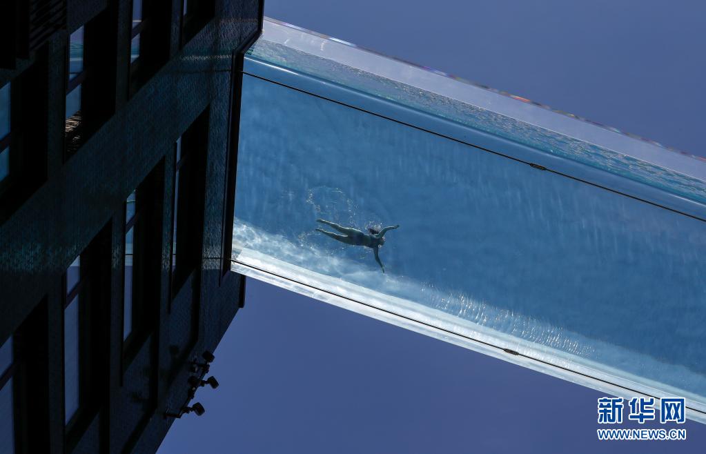 6月2日,一名女子在英國(guó)倫敦南部一個(gè)建造于兩棟公寓樓之間的“空中泳池”游泳。