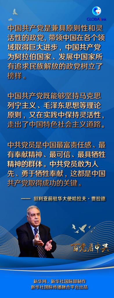 新華社大馬士革6月3日電(記者汪健 鄭一晗)敘利亞前駐華大使哈拉夫·賈拉德日前在大馬士革接受新華社記者專訪時說,中國共產黨是兼具原則性和靈活性的政黨,帶領中國在各個領域取得巨大進步,“中國共產黨為阿拉伯國家、發(fā)展中國家所有追求民族解放的政黨樹立了榜樣”。