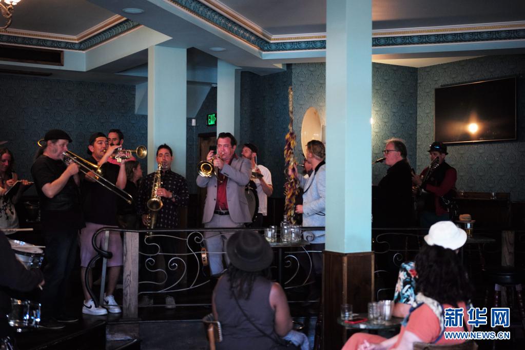 6月15日,一支樂隊(duì)在美國加利福尼亞州舊金山的一家酒吧內(nèi)演奏。