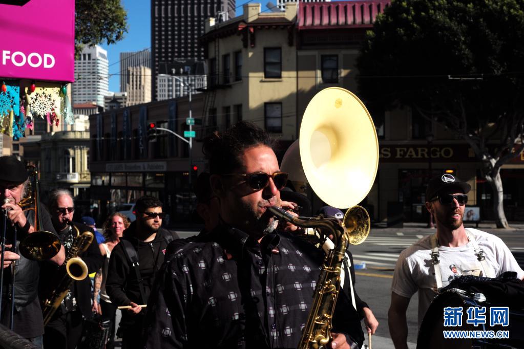 6月15日,一支樂隊(duì)在美國(guó)加利福尼亞州舊金山街頭演奏。