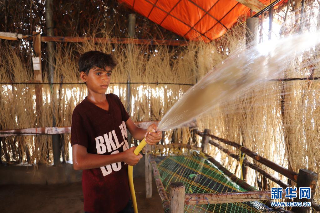6月17日,一名男孩在也門北部哈杰省的一座難民營(yíng)內(nèi)給自家的茅草屋澆水降溫。