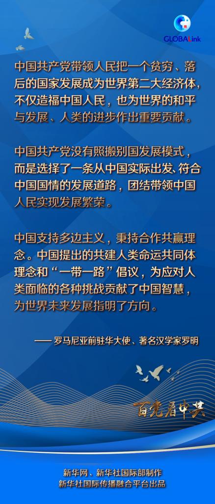 新華社布加勒斯特6月19日電(記者林惠芬 陳進(jìn))羅馬尼亞前駐華大使、著名漢學(xué)家羅明日前在布加勒斯特接受新華社記者專(zhuān)訪時(shí)表示,中國(guó)共產(chǎn)黨帶領(lǐng)人民把一個(gè)貧窮、落后的國(guó)家發(fā)展成為世界第二大經(jīng)濟(jì)體,不僅造福中國(guó)人民,也為世界的和平與發(fā)展、人類(lèi)的進(jìn)步作出重要貢獻(xiàn)。