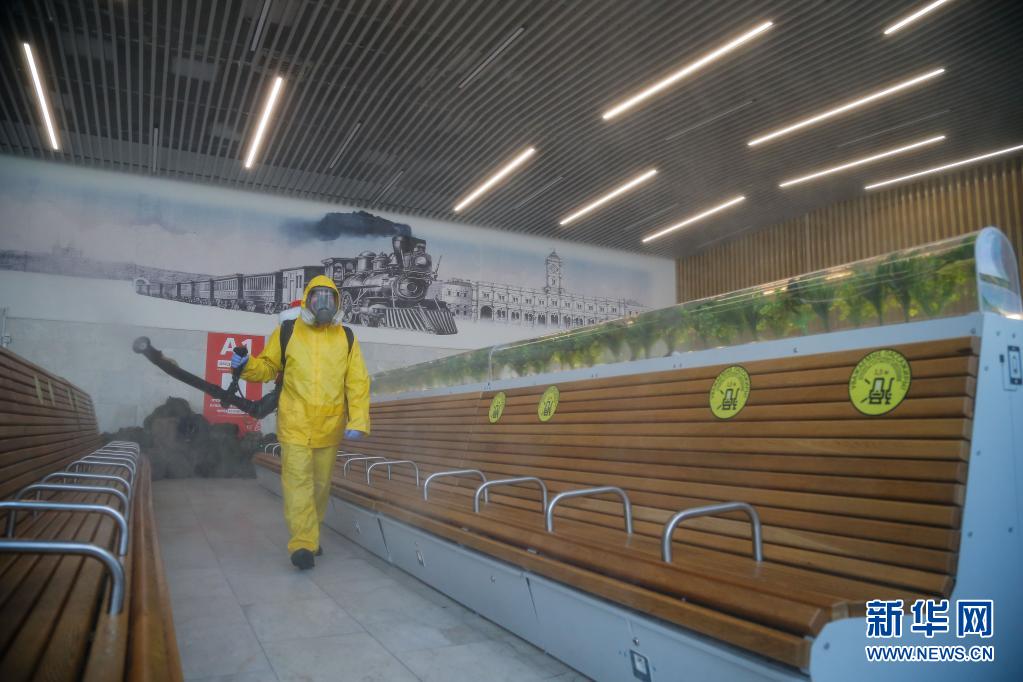 6月24日,工作人員身著防護(hù)服在俄羅斯莫斯科一個火車站進(jìn)行消毒作業(yè)。